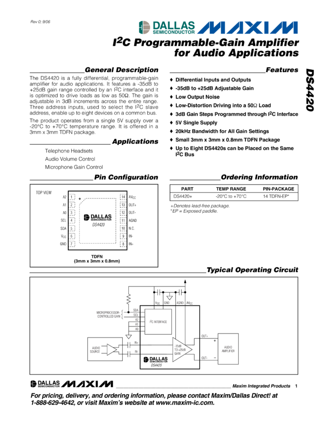 DS4420 I²C Programmable Gain Amplifier for Audio Applications