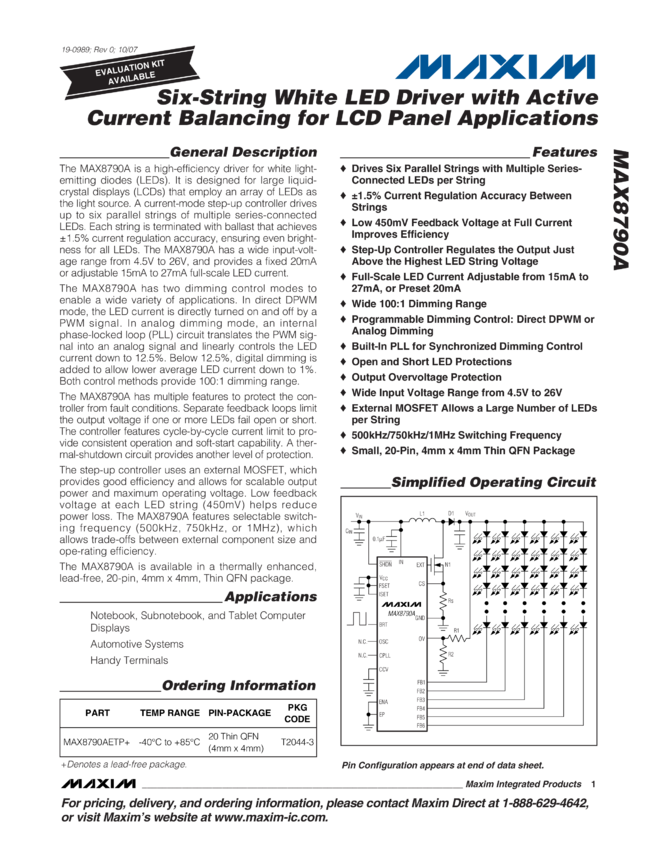 MAX8790A Six-String White LED Driver with Active Current Balancing for LCD Panel Applications