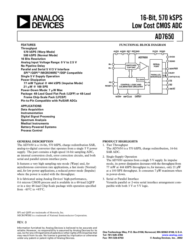 16-Bit 570 kSPS CMOS Successive Approximation PulSAR® ADC with No Missing Codes