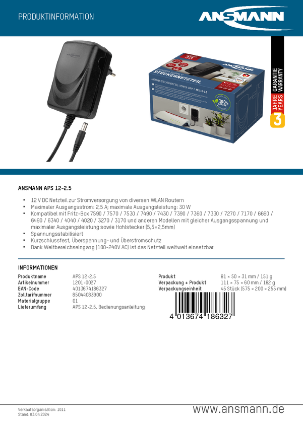 Zasilacz/Zasilanie Ansmann APS 12-2.5 2.5 A 30 W