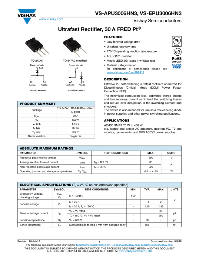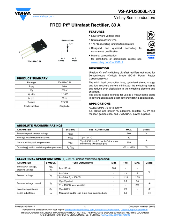Ultrafast Soft Recovery Diode, 60 A FRED Pt®