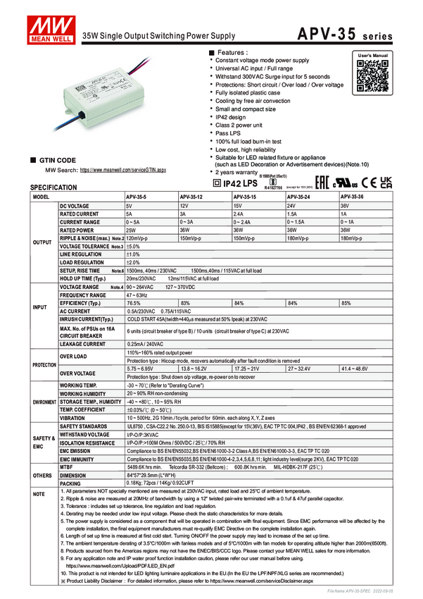 MEAN WELL APV-35-12 Transformator LED Stałonapięciowy 36 W 0 - 3.0 A 12 V/DC nie nadaje się do ściemniania, Zabezpieczen