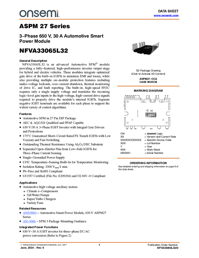 Intelligent Power Module (IPM), ASPM27-V3, AEC-Q & AQG324, Automotive, Inverter 650V,60A, Fast Switching