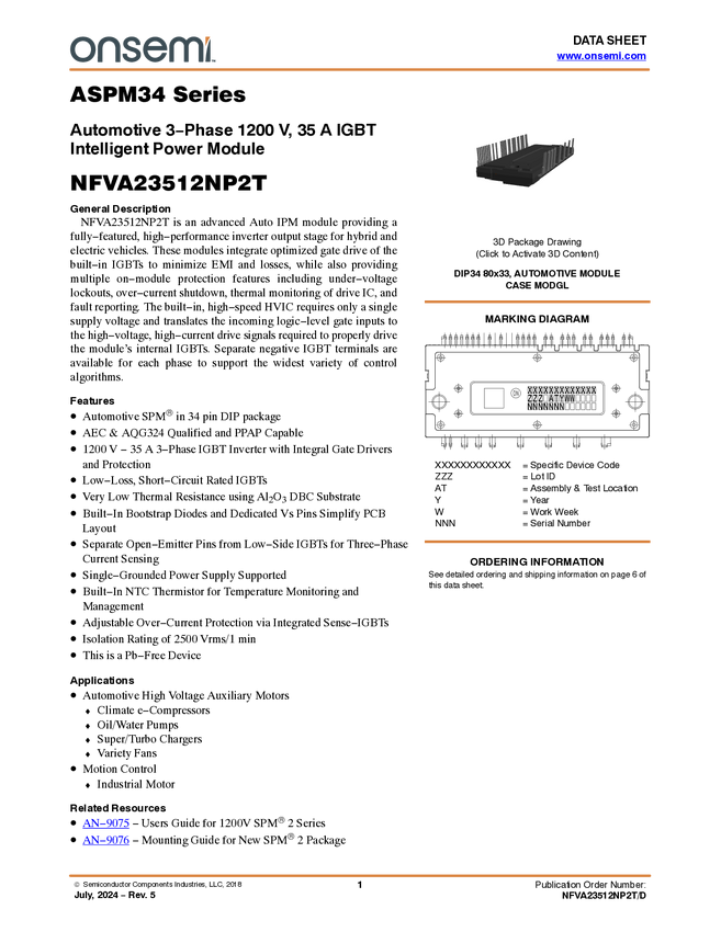 Intelligent Power Module (IPM), AEC-Q & AQG324, Automotive, Inverter 1200V, 35A