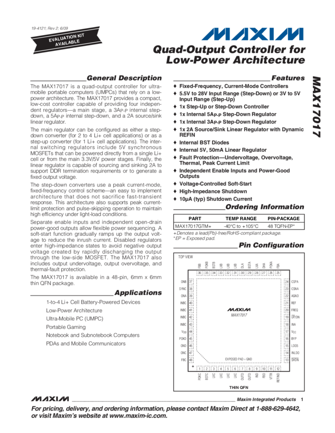 MAX17017 Quad-Output Controller for Low Power Architecture