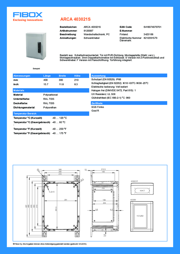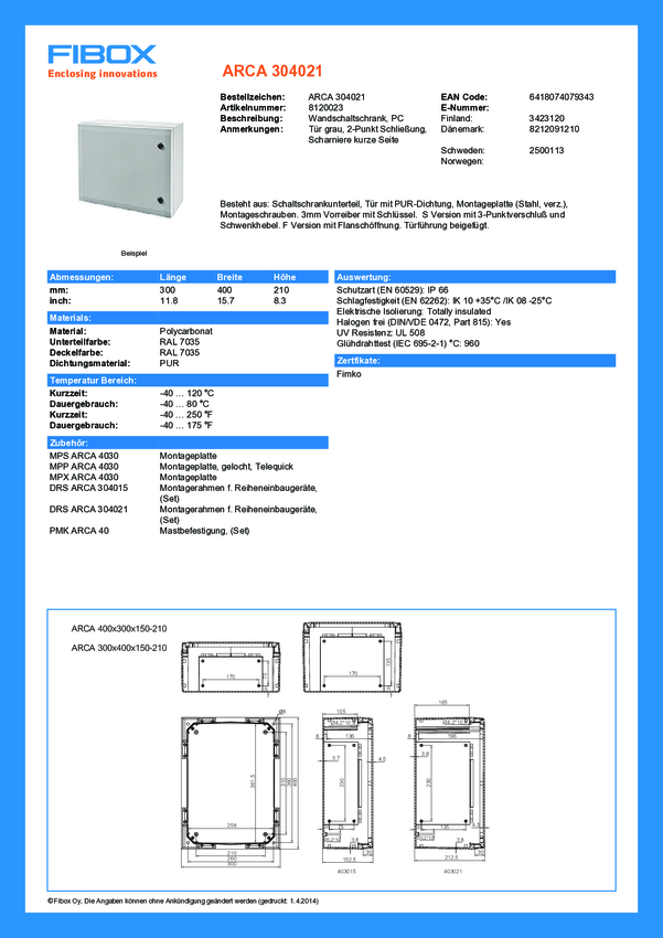 Szafka instalacyjna Fibox ARCA 403021 8120007, poliwęglan, 400 x 300 x 210 x 210, IP66, 1 szt.