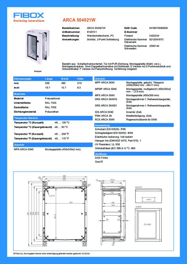 Obudowa instalacyjna ścienna Fibox ARCA 504021W 8120131, poliwęglan, 500 x 400 x 210 x 210, szaro-biały (ral 7035), 1 sz