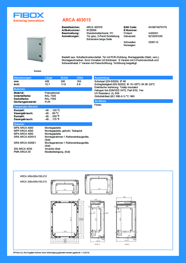 Obudowa instalacyjna ścienna Fibox ARCA 403015 No MP 8120006N, poliwęglan, 400 x 300 x 150 , szary, 1 szt.