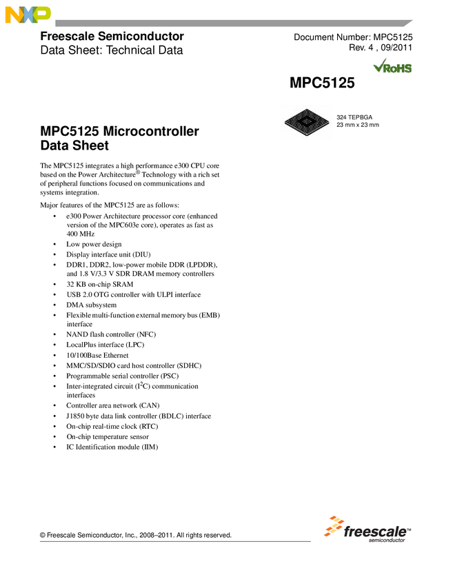 MPC5125 32-bit MPU, e300 Power Architecture core, 400MHz, PBGA 324