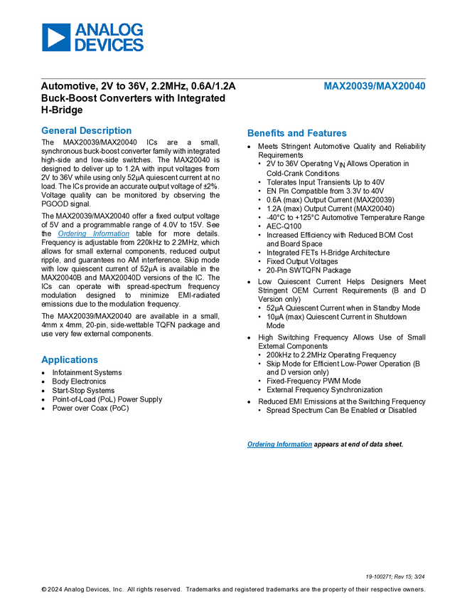 Automotive, 2V to 36V, 2.2MHz, 0.6A/1.2A Buck-Boost Converters with Integrated H-Bridge Architecture