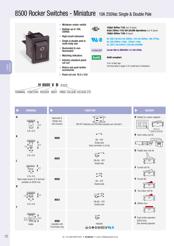 Przełącznik; ROCKER; ON-OFF; 10A; 250V AC; DPST; czarny; 2 pozycje; T8550VBAAA; ARCOLECTRIC; RoHS