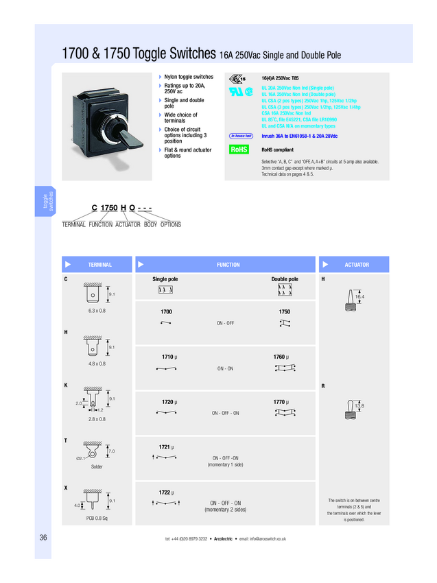 Arcolectric (Bulgin Ltd.) C1720ROAAE Przełącznik dźwigienkowy C1720ROAAE, 1 x wł/wył/wł, 250 V/AC, 16 A, 1 szt.
