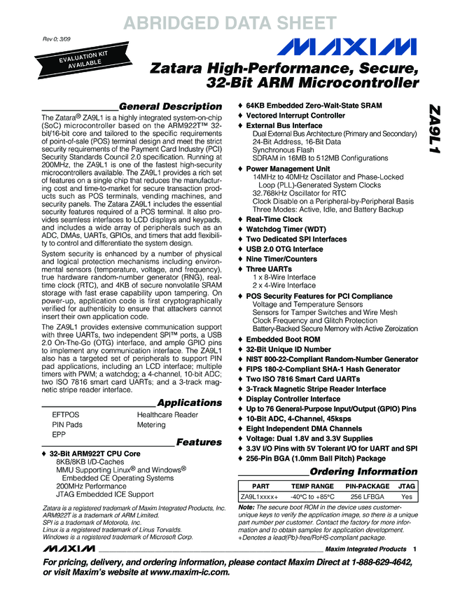 ZA9L1 DeepCover Secure Microcontroller with ARM922T Processor Core