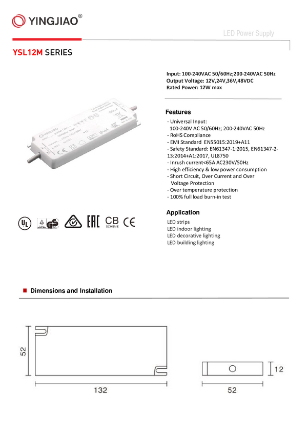 Zasilacz do oświetlenia LED płaski 24V 0,5A 12W YINGJIAO | YSL12M-2400500