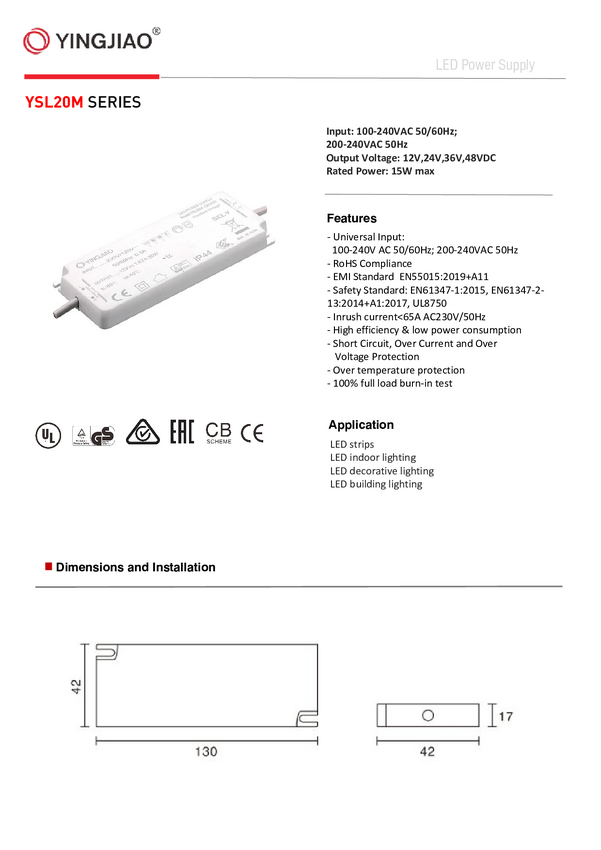 Zasilacz do oświetlenia LED płaski 24V 0,625A 15W YINGJIAO | YSL20M-2400625