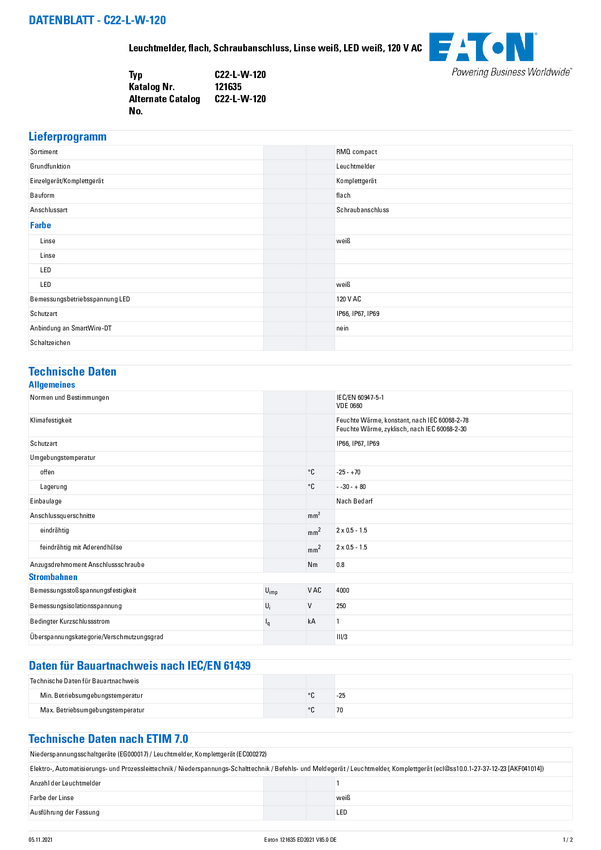 Eaton C22-L-W-120 Podświetlenie wskaźnika płaski biały 120 V/AC 1 szt.