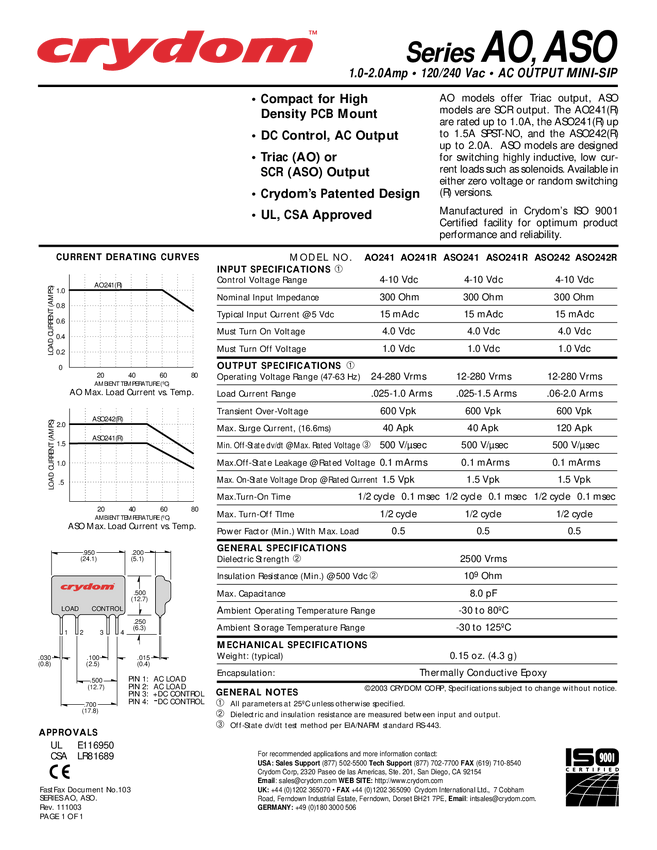 Przekaźnik elektroniczny, Crydom; 0,025-1,5A (RMS) ; 12-280 V (RMS) AC; spst-no; 4-10V DC wersja do druku