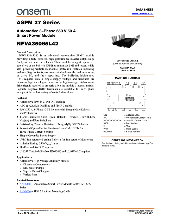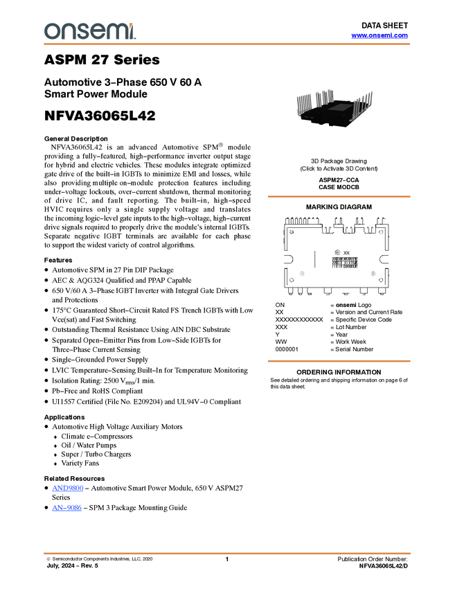 Intelligent Power Module (IPM), ASPM27-V3, AEC-Q & AQG324, Automotive, Inverter 650V,60A, Fast Switching