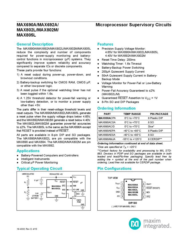 MAX805L &#181P Reset IC (asserted high) with Watchdog and Battery Backup