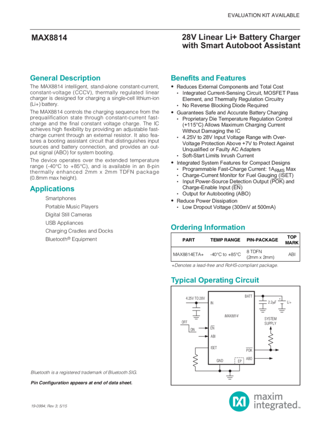 MAX8814 28V Linear Li+ Battery Charger with Smart Autoboot Assistant