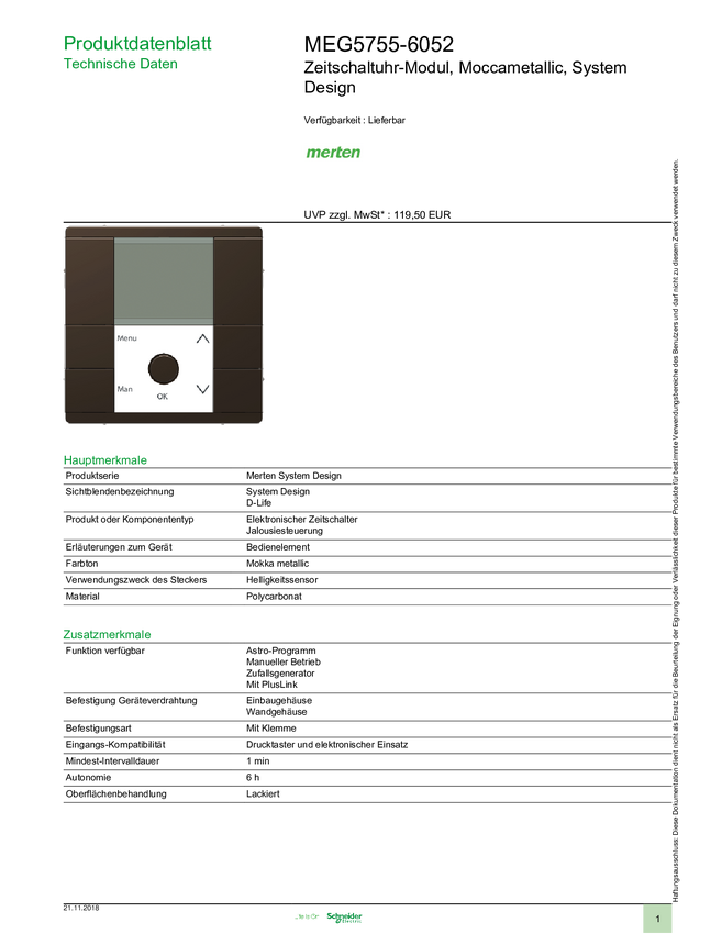 Merten MEG5755-6052 Wyłącznik czasowy do montażu podtynkowego cyfrowy funkcja Astro, funkcja losowa