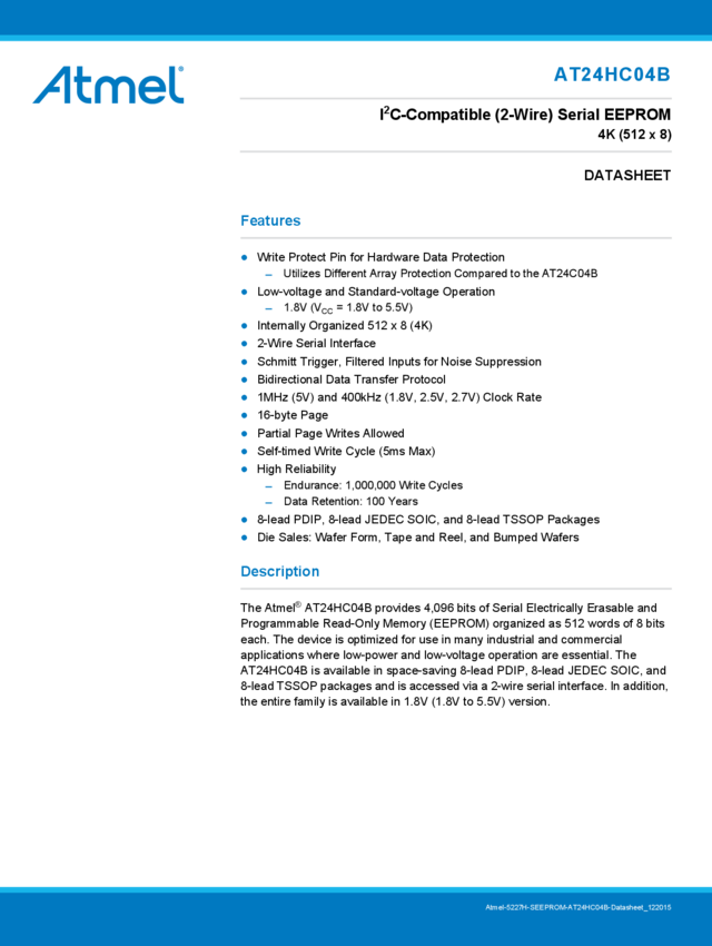 4Kb I²C-compatible 2-wire Serial EEPROM with Half Memory Write Protect