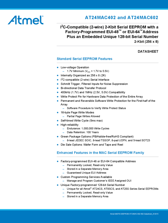 AT24MAC402/AT24MAC602 I²C-Compatible (Two-Wire) Serial EEPROM with a Factory‑Programmed EUI-48™ or EUI-64™ Address Plus a Unique, Factory-Programmed 128‑Bit Serial Number 2‑Kbit (256 x 8)
