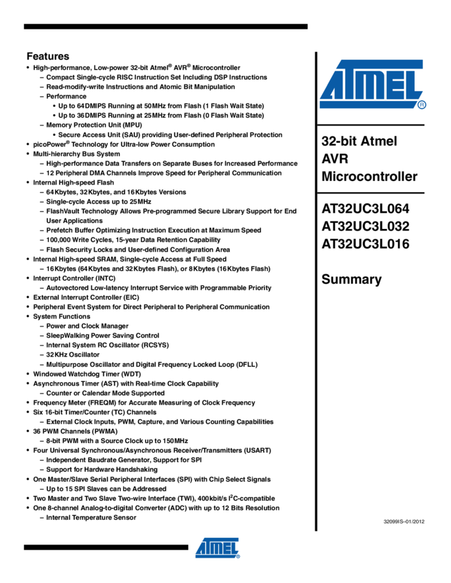 32-bit Atmel® AVR® Microcontroller, 128KB Flash, 48-pin, CAT Module, FlashVault code protection