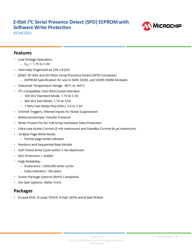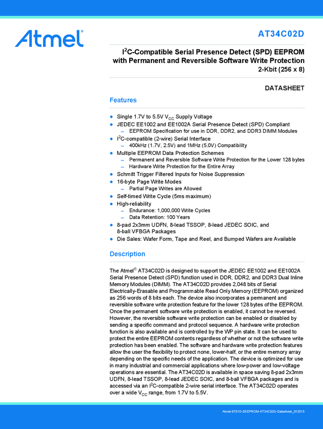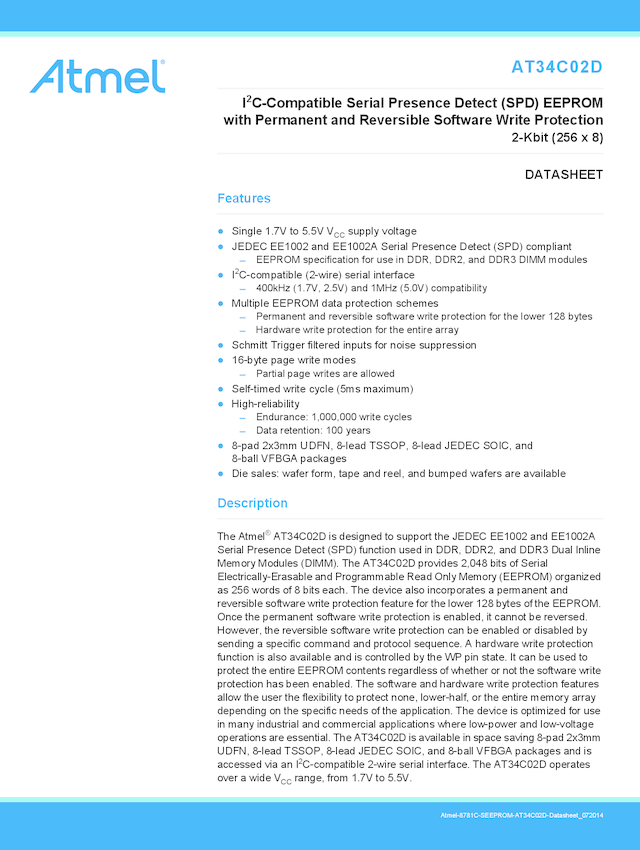 AT34C02D - 2-Kbit I²C Serial Presence Detect (SPD) EEPROM with Software Write Protection