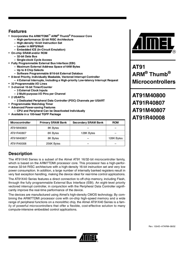 AT91X40 Series: AT91M40800, AT91R40807, AT91M40807, AT91R40008 Datasheet
