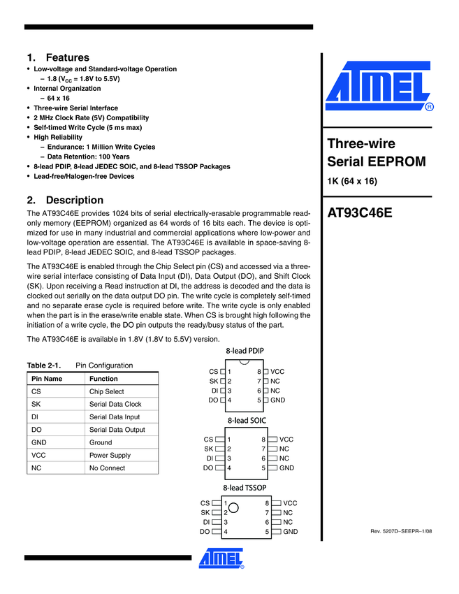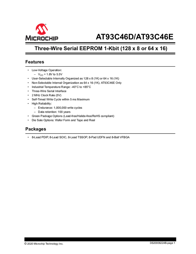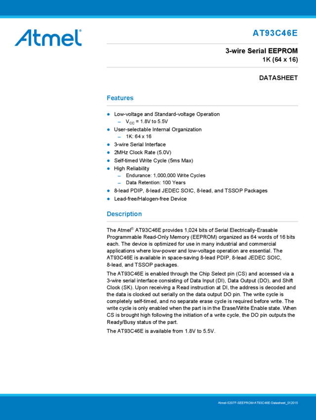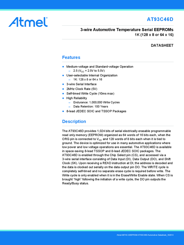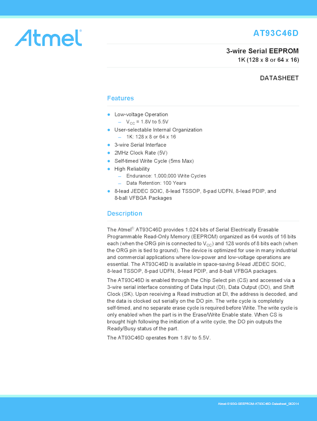 AT93C46D/AT93C46E Three-Wire Serial EEPROM Data Sheet