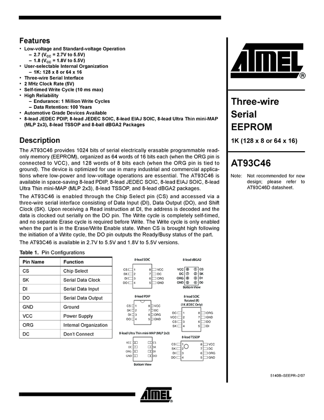 AT93C46D/AT93C46E Three-Wire Serial EEPROM Data Sheet