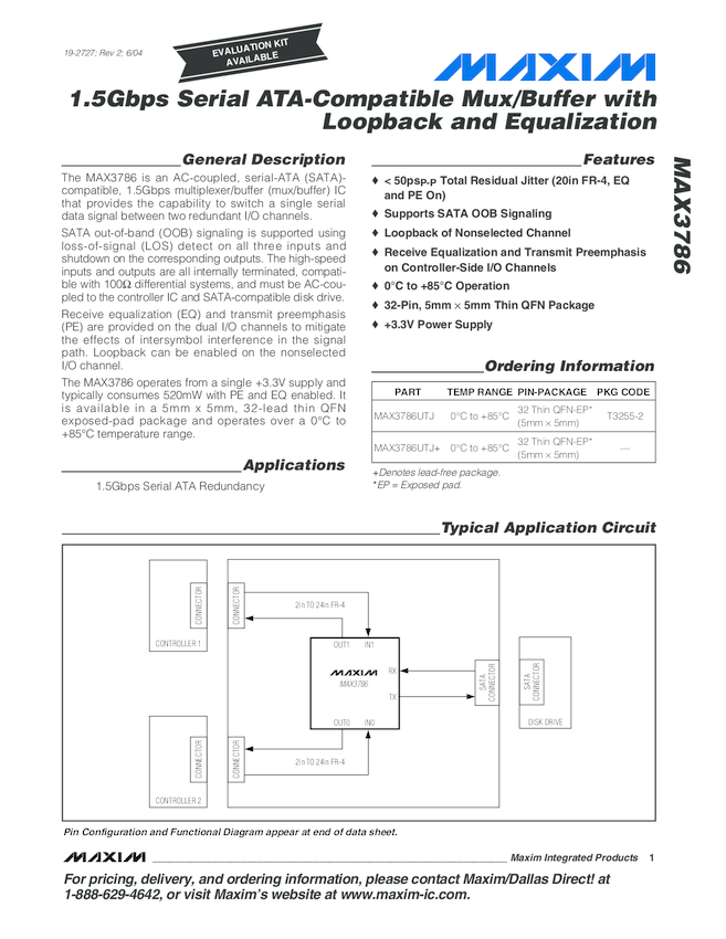 MAX3786 1.5Gbps Serial ATA-Compatible Mux/Buffer with Loopback and Equalization