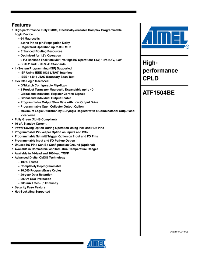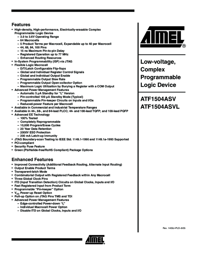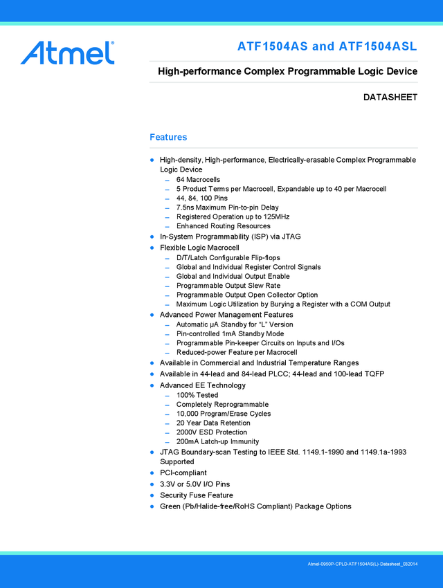 ATF1504AS(L) 5V 64-Macrocell CPLD Data Sheet