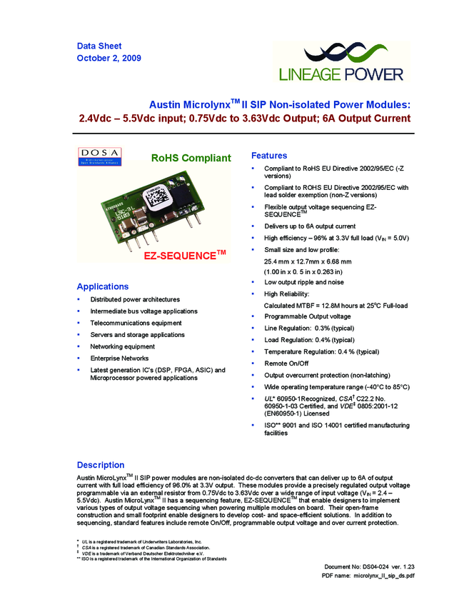 Module DC-DC 1-OUT 0.75V to 3.63V 6A 6-Pin SIP