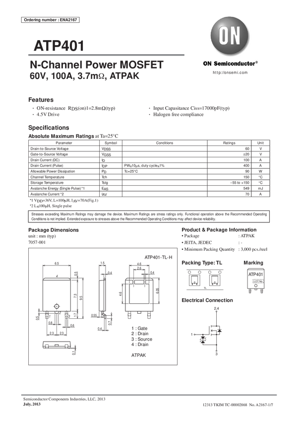 Power MOSFET 60V 100A 3.7 mOhm Single N-Channel ATPAK