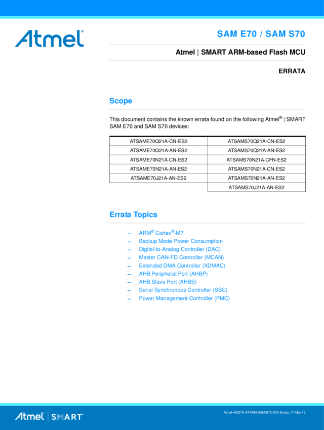 SAM E70 / SAM S70 Errata for Engineering Samples -ES2 Datasheet