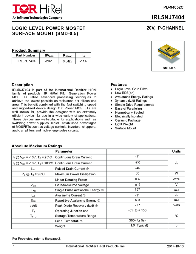 IRL5NJ7404SCX is a high reliability, -20V, single, P-channel MOSFET in a SMD-0.5 package, lead attached. It uses HEXFET MOSFET technology to achieve low on-state resistance, high transconductance, and superior reverse energy and diode recovery dv/dt capability. Ideal for power supplies, motor controls, choppers, audio amplifiers, and other high-energy pulse circuits in defense applications. It has TX level screening.
