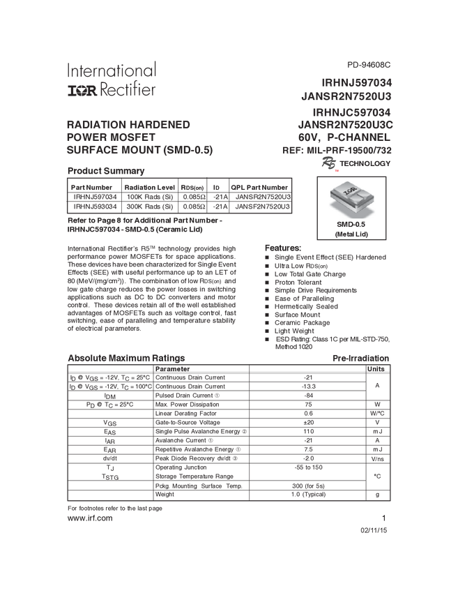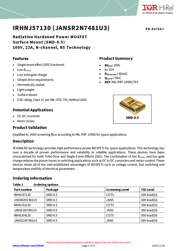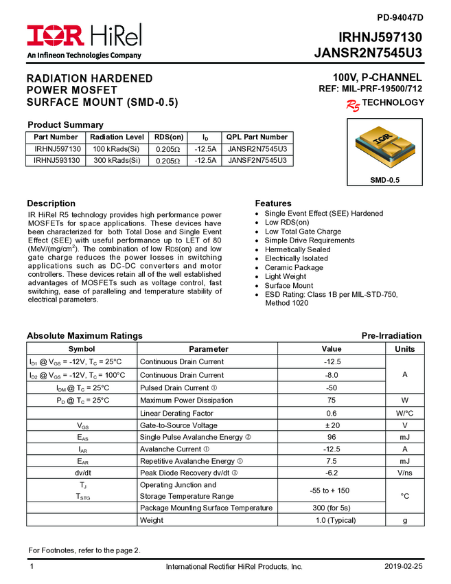 IRHNJ597130SCVA P-channel MOSFET is rad hard, with -100V and -12.5A, in a single SMD-0.5 package with lead attached. It has electrical performance up to 100krad(Si) TID and QIRL classification. IR HiRel R5 technology provides proven flight-heritage in high reliability space applications. The device's low RDS(on) and low gate charge make it ideal for switching applications.