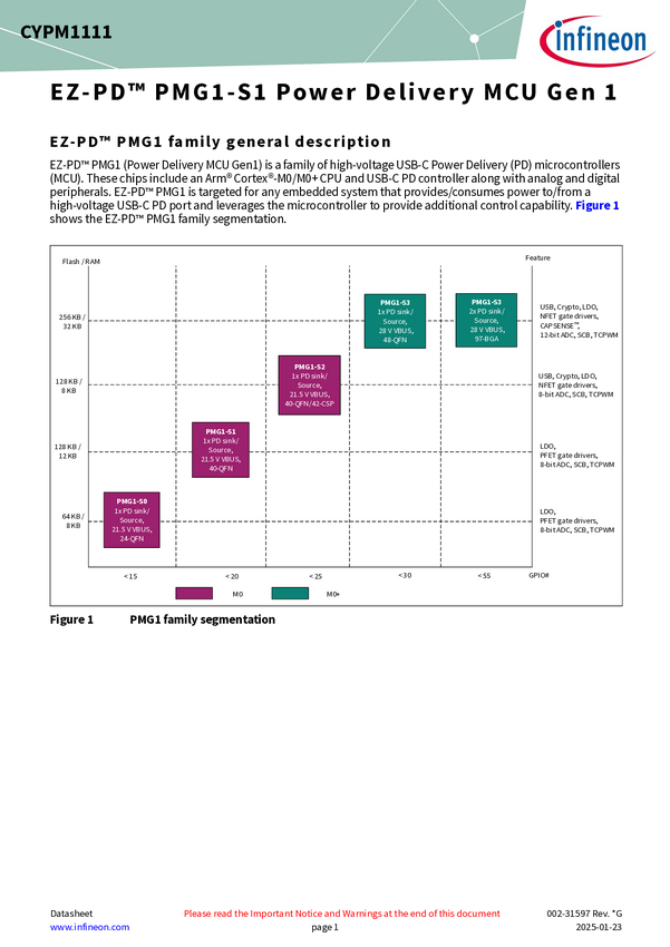 The simplest USB-C HV MCU supporting Dual Role Port, including moist detection EZ-PDTM PMG1-S1 CYPM1111-40LQXI is the tray packing option of the simplest MCU supporting Dual Role Port (DRP) USB-C PD applications. The USB PD block in the EZ-PDTM PMG1-S1 is used for USB-C source/Sink attach detection and negotiating a power delivery contract. This includes the BMC PHY, slew rate-controlled gate drivers for the source and sink side FETs, overvoltage, undervoltage, overcurrent, and short circuit protection cir