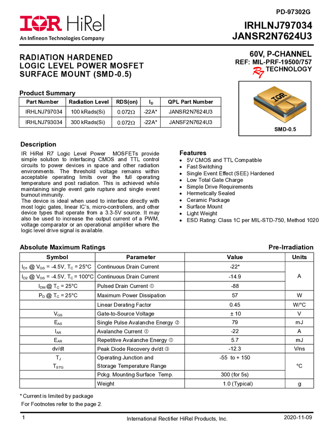 IRHLNJ797034SCSA P-channel MOSFET is rad hard, with -60V and -22A, in a single SMD-0.5 package with lead attached. It has electrical performance up to 100krad(Si) TID and QIRL classification. IR HiRel R7 technology provides proven flight-heritage in high reliability space applications. The device's low RDS(on) and low gate charge make it ideal for switching applications.