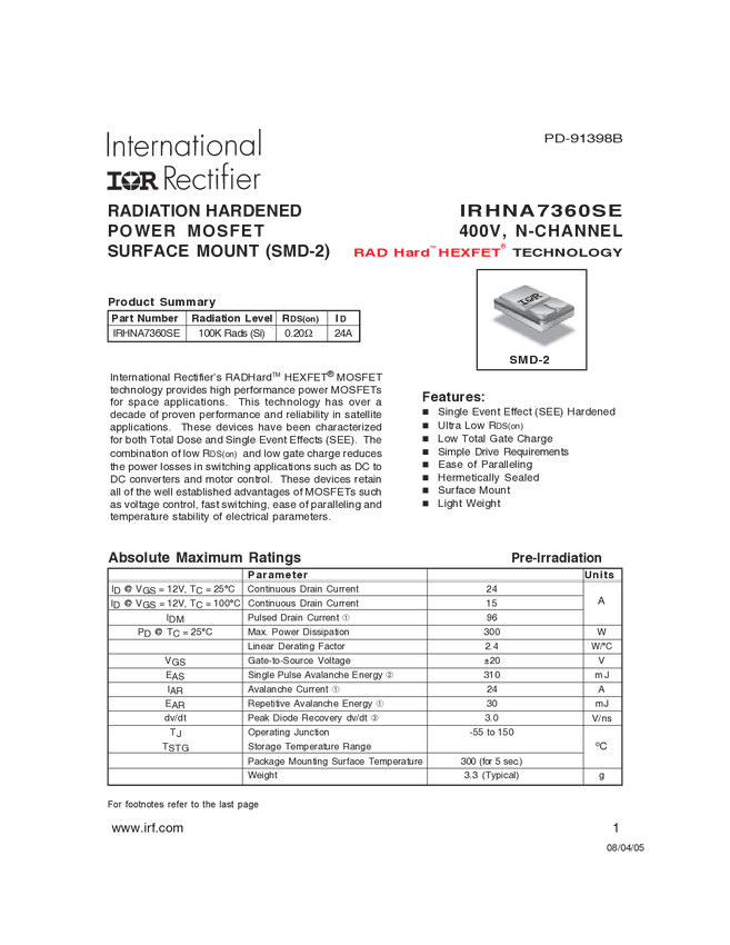 The R4 rad hard IRHNA7360SESCSA is a high-performance N-channel MOSFET designed for space applications. With rad hard design, 400V/15A rating, and SMD-2 package, this QIRL classified device offers low RDS(on) and gate charge, minimizing switching power losses. It also features MOSFET favorites like voltage control, fast switching, and temperature stability. The lead attachment enhances its reliability.