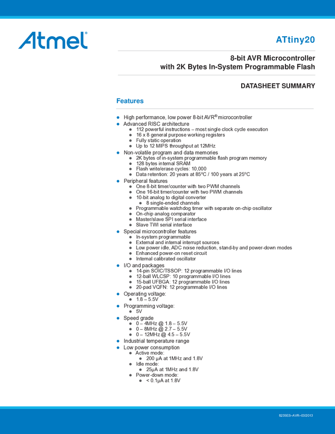 8-bit AVR Microcontroller, 2KB Flash, 14/15/20-pin