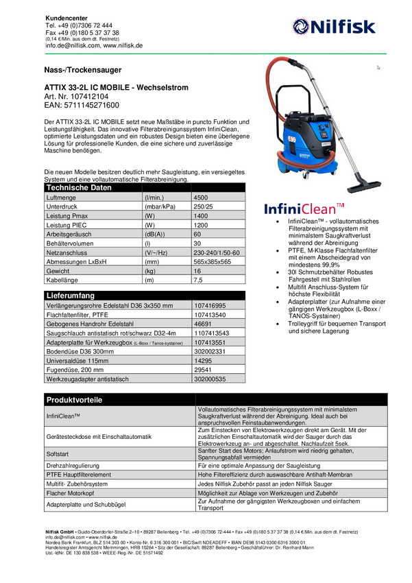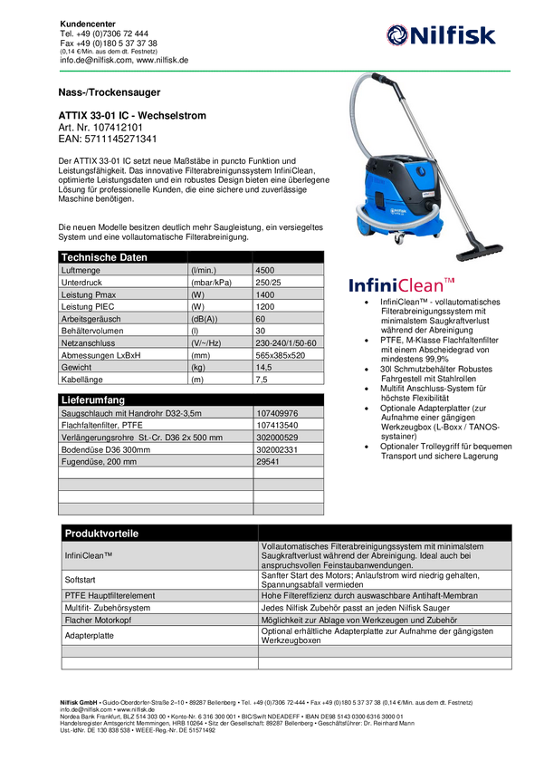 Odkurzacz do pracy na sucho i mokro Nilfisk Attix 33-01 IC 107412101 4500 l/min 30 l 1 szt.