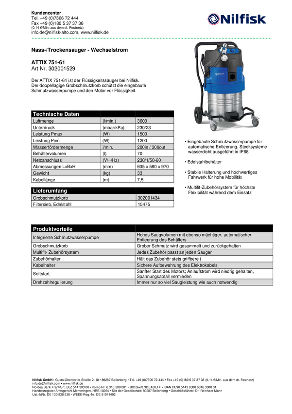 Odkurzacz do pracy na sucho i mokro Nilfisk Attix 751-61 302001529 3600 l/min 70 l 1 szt.