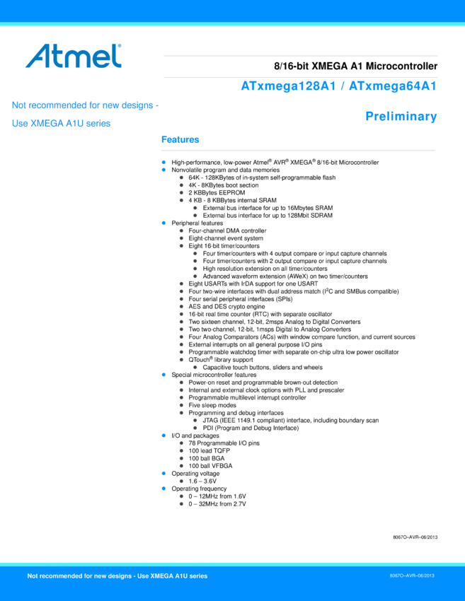 8/16-bit AVR XMEGA A1U Microcontroller, 128KB Flash, 100-pin, USB Full-speed Device