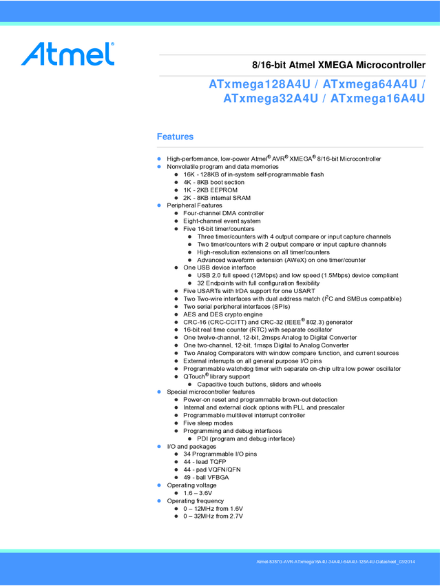 8/16-bit AVR XMEGA A3U Microcontroller, 128KB Flash, 64-pin, USB Full-speed Device