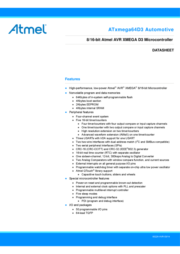 8/16-bit AVR XMEGA D3 Microcontroller, 128KB Flash, 64-pin