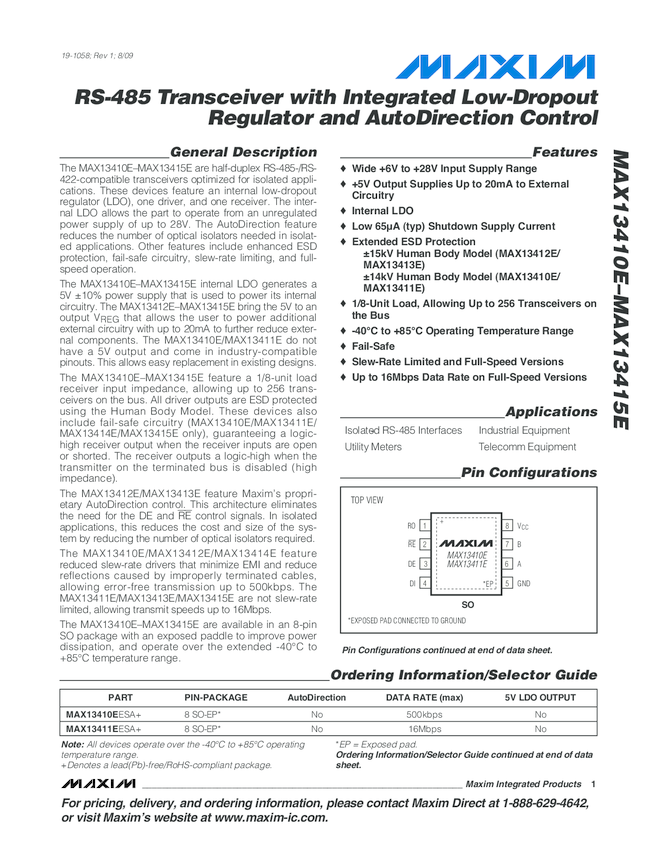 MAX13413E RS-485 Half Duplex 16Mbps Transceiver with integrated LDO and Autodirection