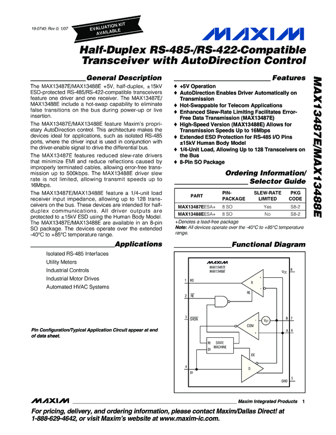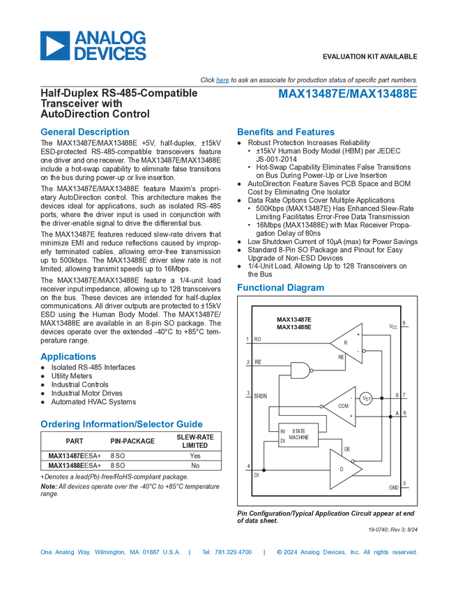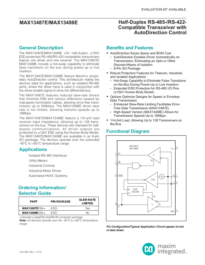 MAX13487E, MAX13488E Half-Duplex RS-485/RS-422-Compatible Transceiver with AutoDirection Control